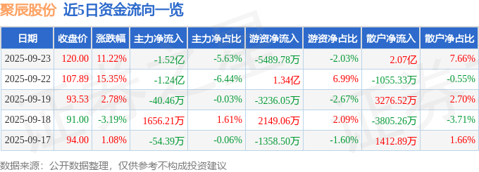 证券之星消息,截至2025年9月23日收盘,聚辰股份(688123)报收于120.0元,上涨11.22%,换手率14.17%,成交量22.43万手,成交额26.99亿元。
