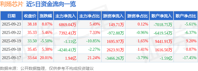 证券之星消息,截至2025年9月23日收盘,利扬芯片(688135)报收于38.18元,上涨8.07%,换手率16.76%,成交量34.03万手,成交额12.52亿元。