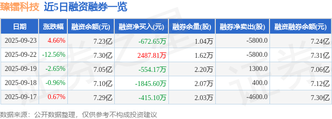 臻镭科技融资融券信息显示,融资方面,当日融资买入1.45亿元,融资偿还1.52亿元,融资净偿还672.65万元。融券方面,融券卖出1400.0股,融券偿还7200.0股,融券余量1.04万股,融券余额65.88万元。融资融券余额7.24亿元。
