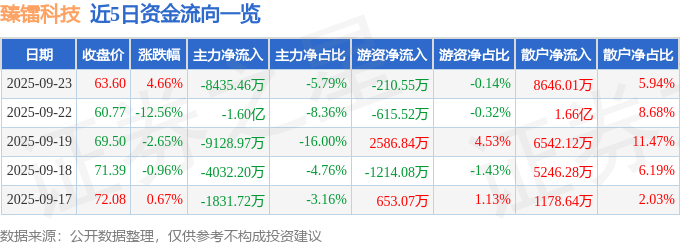 证券之星消息,截至2025年9月23日收盘,臻镭科技(688270)报收于63.6元,上涨4.66%,换手率11.0%,成交量23.54万手,成交额14.56亿元。