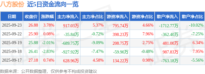 证券之星消息,截至2025年9月23日收盘,八方股份(603489)报收于26.88元,上涨3.78%,换手率2.79%,成交量6.55万手,成交额1.71亿元。