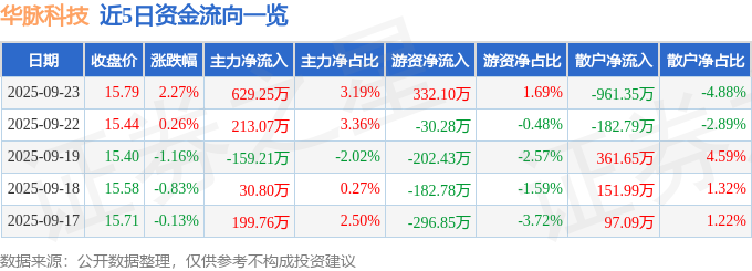 证券之星消息,截至2025年9月23日收盘,华脉科技(603042)报收于15.79元,上涨2.27%,换手率7.89%,成交量12.66万手,成交额1.97亿元。