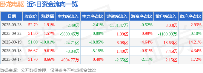 证券之星消息,截至2025年9月23日收盘,卧龙电驱(600580)报收于52.79元,上涨1.91%,换手率12.71%,成交量198.61万手,成交额103.46亿元。