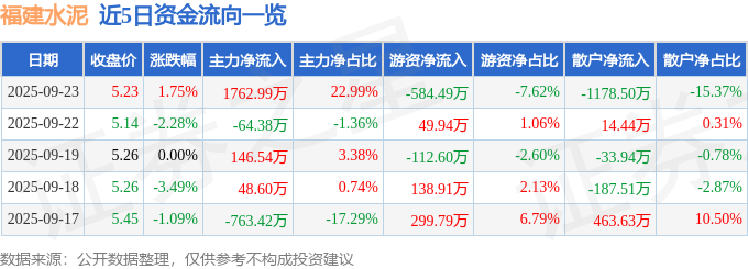 证券之星消息,截至2025年9月23日收盘,福建水泥(600802)报收于5.23元,上涨1.75%,换手率3.26%,成交量14.94万手,成交额7667.19万元。