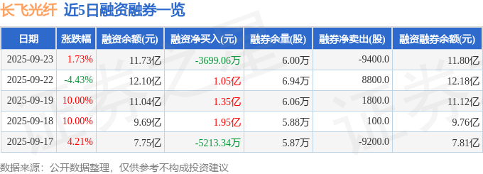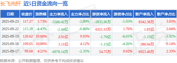 证券之星消息,截至2025年9月23日收盘,长飞光纤(601869)报收于117.27元,上涨1.73%,换手率5.87%,成交量23.84万手,成交额27.54亿元。