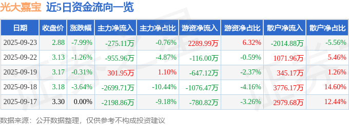 证券之星消息,截至2025年9月23日收盘,光大嘉宝(600622)报收于2.88元,下跌7.99%,换手率8.28%,成交量124.2万手,成交额3.62亿元。