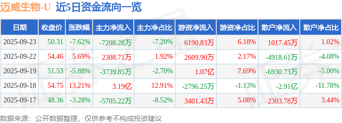 证券之星消息,截至2025年9月23日收盘,迈威生物(688062)报收于50.31元,下跌7.62%,换手率9.56%,成交量19.53万手,成交额10.01亿元。