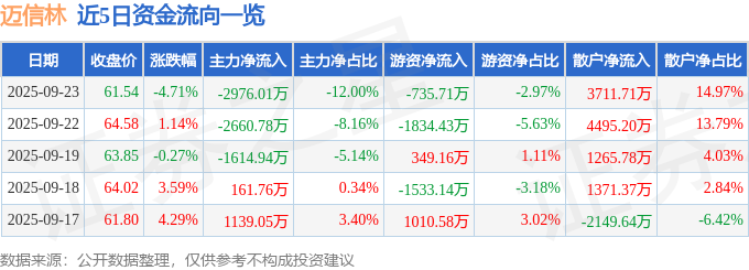 证券之星消息,截至2025年9月23日收盘,迈信林(688685)报收于61.54元,下跌4.71%,换手率2.76%,成交量4.02万手,成交额2.48亿元。