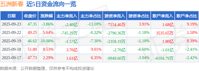 证券之星消息,截至2025年9月23日收盘,五洲新春(603667)报收于47.35元,下跌3.86%,换手率10.42%,成交量38.14万手,成交额18.3亿元。