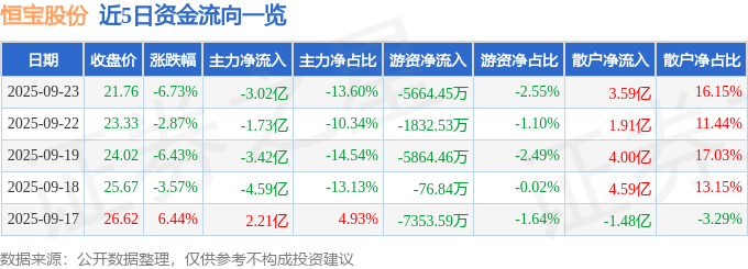证券之星消息,截至2025年9月23日收盘,恒宝股份(002104)报收于21.76元,下跌6.73%,换手率16.82%,成交量100.87万手,成交额22.22亿元。