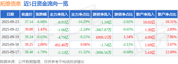 证券之星消息,截至2025年9月23日收盘,拓维信息(002261)报收于37.14元,下跌6.68%,换手率12.6%,成交量144.45万手,成交额54.72亿元。