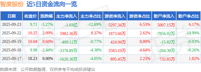 证券之星消息,截至2025年9月23日收盘,智度股份(000676)报收于9.71元,下跌5.27%,换手率6.58%,成交量83.24万手,成交额8.12亿元。