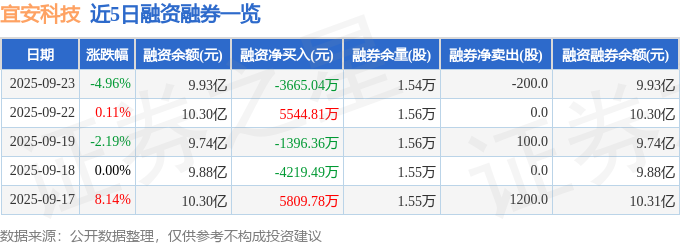 宜安科技融资融券信息显示,融资方面,当日融资买入1.34亿元,融资偿还1.71亿元,融资净偿还3665.04万元。融券方面,融券卖出0.0股,融券偿还200.0股,融券余量1.54万股,融券余额27.43万元。融资融券余额9.93亿元。