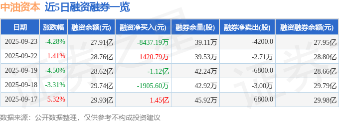 中油资本融资融券信息显示,融资方面,当日融资买入2.39亿元,融资偿还3.23亿元,融资净偿还8437.19万元。融券方面,融券卖出2.16万股,融券偿还2.58万股,融券余量39.11万股,融券余额402.83万元。融资融券余额27.95亿元。