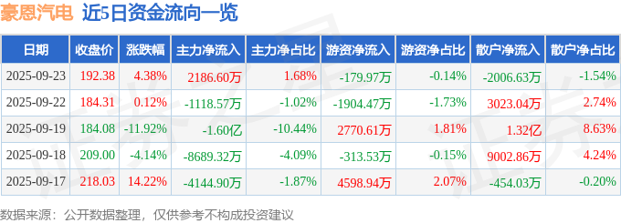 证券之星消息,截至2025年9月23日收盘,豪恩汽电(301488)报收于192.38元,上涨4.38%,换手率29.48%,成交量6.9万手,成交额13.04亿元。