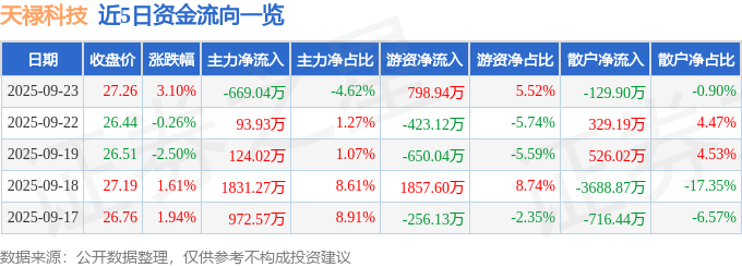 证券之星消息,截至2025年9月23日收盘,天禄科技(301045)报收于27.26元,上涨3.1%,换手率8.47%,成交量5.42万手,成交额1.45亿元。