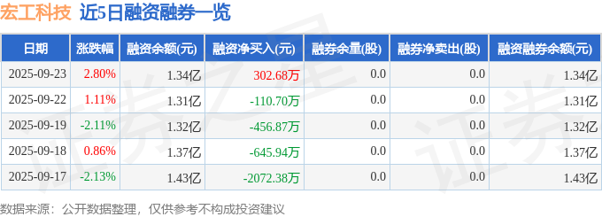 宏工科技融资融券信息显示,融资方面,当日融资买入4286.32万元,融资偿还3983.64万元,融资净买入302.68万元。融券方面,融券卖出0.0股,融券偿还0.0股,融券余量0.0股,融券余额0.0万元。融资融券余额1.34亿元。