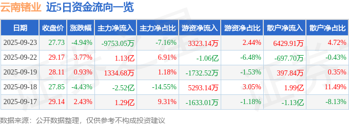 证券之星消息,截至2025年9月23日收盘,云南锗业(002428)报收于27.73元,下跌4.94%,换手率7.46%,成交量48.74万手,成交额13.62亿元。