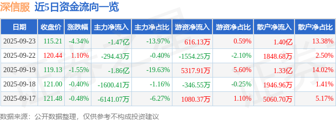 证券之星消息,截至2025年9月23日收盘,深信服(300454)报收于115.21元,下跌4.34%,换手率3.25%,成交量9.03万手,成交额10.49亿元。