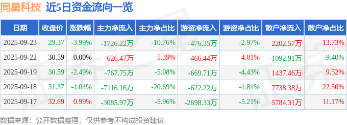 证券之星消息,截至2025年9月23日收盘,同星科技(301252)报收于29.37元,下跌3.99%,换手率11.53%,成交量5.46万手,成交额1.6亿元。