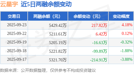 证券之星消息,9月23日,云星宇(873806)融资买入445.5万元,融资偿还227.68万元,融资净买入217.82万元,融资余额5429.42万元。