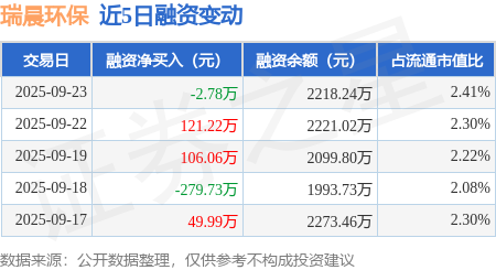 证券之星消息,9月23日,瑞晨环保(301273)融资买入596.74万元,融资偿还599.52万元,融资净卖出2.78万元,融资余额2218.24万元。