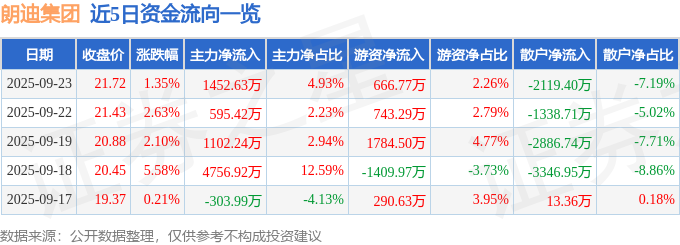 9月23日的资金流向数据方面,主力资金净流入1452.63万元,占总成交额4.93%,游资资金净流入666.77万元,占总成交额2.26%,散户资金净流出2119.4万元,占总成交额7.19%。