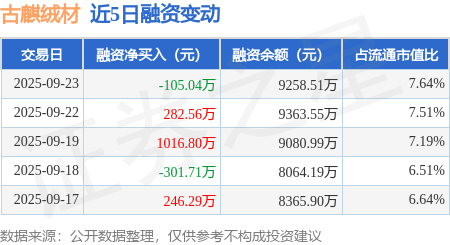 证券之星消息,9月23日,古麒绒材(001390)融资买入806.09万元,融资偿还911.14万元,融资净卖出105.04万元,融资余额9258.51万元。