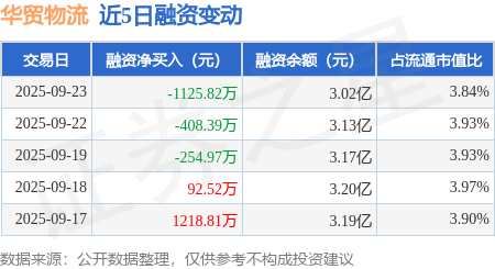 证券之星消息,9月23日,华贸物流(603128)融资买入1126.74万元,融资偿还2252.56万元,融资净卖出1125.82万元,融资余额3.02亿元。