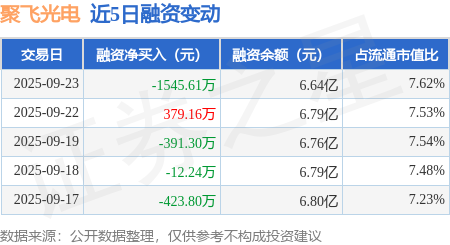 证券之星消息,9月23日,聚飞光电(300303)融资买入5971.56万元,融资偿还7517.18万元,融资净卖出1545.61万元,融资余额6.64亿元,近20个交易日中有14个交易日出现融资净买入。