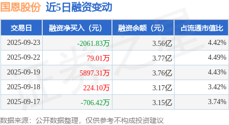 证券之星消息,9月23日,国恩股份(002768)融资买入2602.88万元,融资偿还4664.71万元,融资净卖出2061.83万元,融资余额3.56亿元,近20个交易日中有11个交易日出现融资净买入。