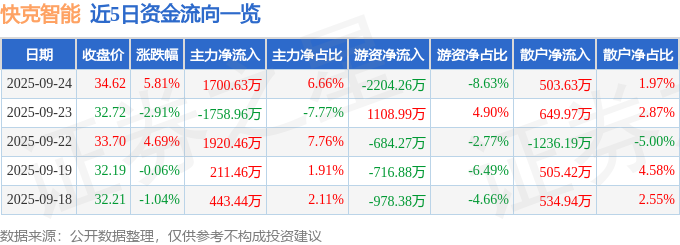 证券之星消息,截至2025年9月24日收盘,快克智能(603203)报收于34.62元,上涨5.81%,换手率3.03%,成交量7.56万手,成交额2.55亿元。
