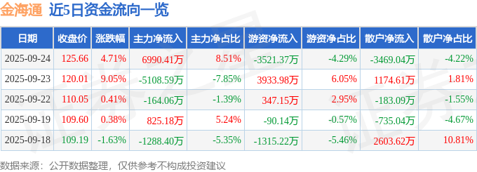 证券之星消息,截至2025年9月24日收盘,金海通(603061)报收于125.66元,上涨4.71%,换手率15.97%,成交量6.68万手,成交额8.22亿元。
