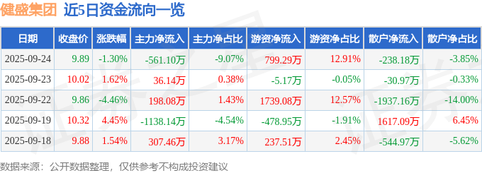 证券之星消息,截至2025年9月24日收盘,健盛集团(603558)报收于9.89元,下跌1.3%,换手率1.83%,成交量6.27万手,成交额6189.76万元。