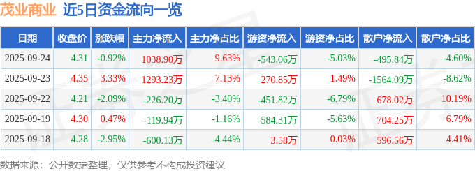证券之星消息,截至2025年9月24日收盘,茂业商业(600828)报收于4.31元,下跌0.92%,换手率1.46%,成交量25.21万手,成交额1.08亿元。