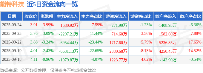 证券之星消息,截至2025年9月24日收盘,能特科技(002102)报收于3.91元,上涨3.99%,换手率2.65%,成交量57.48万手,成交额2.21亿元。