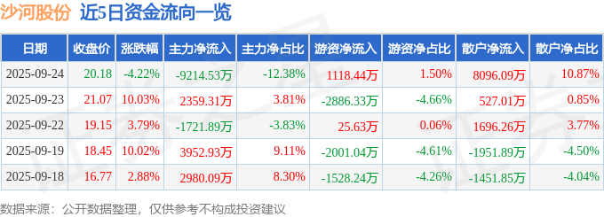 证券之星消息,截至2025年9月24日收盘,沙河股份(000014)报收于20.18元,下跌4.22%,换手率14.46%,成交量34.99万手,成交额7.44亿元。
