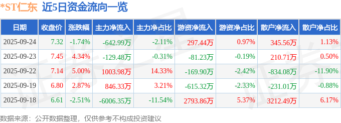 证券之星消息,截至2025年9月24日收盘,*ST仁东(002647)报收于7.32元,下跌1.74%,换手率6.09%,成交量41.24万手,成交额3.05亿元。