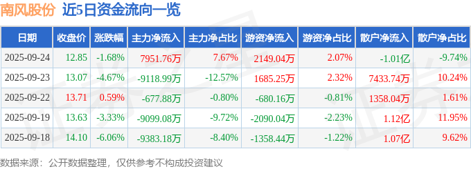 证券之星消息,截至2025年9月24日收盘,南风股份(300004)报收于12.85元,下跌1.68%,换手率16.34%,成交量78.42万手,成交额10.37亿元。