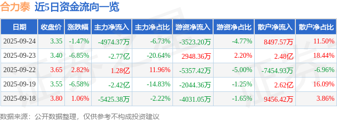 证券之星消息,截至2025年9月24日收盘,合力泰(002217)报收于3.35元,下跌1.47%,换手率3.94%,成交量223.65万手,成交额7.39亿元。
