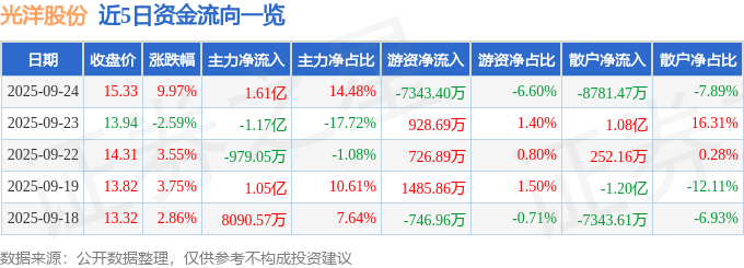 证券之星消息,光洋股份9月24日涨停收盘,收盘价15.33元。该股于13点12分涨停,3次打开涨停,截止收盘封单资金为5606.44万元,占其流通市值0.71%。