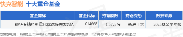 根据2025基金半年报公募基金重仓股数据,重仓该股的公募基金共1家,其中持有数量最多的公募基金为银华基金的银华专精特新量化优选股票发起A。银华专精特新量化优选股票发起A目前规模为0.32亿元,最新净值1.4(9月23日),较上一交易日下跌0.48%,近一年上涨100.37%。该公募基金现任基金经理为杨腾。杨腾在任的基金产品包括:银华新能源新材料A,管理时间为2021年11月29日至今,期间收益率为-31.97%;银华食品饮料量化股票发起式A,管理时间为2021年11月29日至今,期间收益率为-32.07%;银华医疗健康量化优选A,管理时间为2021年11月29日至今,期间收益率为-26.86%;银华稳健增利灵活配置混合A,管理时间为2021年11月29日至今,期间收益率为-0.61%。