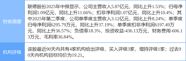 2025年8月22日,中邮证券研究员刘卓,陈基赟发布了对联德股份的研报《Q2业绩超预期,数据中心有望带动需求上行》,该研报对联德股份给出“买入”评级。研报中预计公司2025-2027年营收分别为12.32、15.03、17.71亿元,同比增速分别为12.18%、21.98%、17.81%;归母净利润分别为2.28、2.88、3.54亿元,同比增速分别为21.38%、26.76%、22.88%。公司2025-2027年业绩对应PE估值分别为26.71、21.07、17.15,维持“买入”评级。证券之星数据中心根据近三年发布的研报数据计算,该研报作者对此股的盈利预测准确度为35.75%。