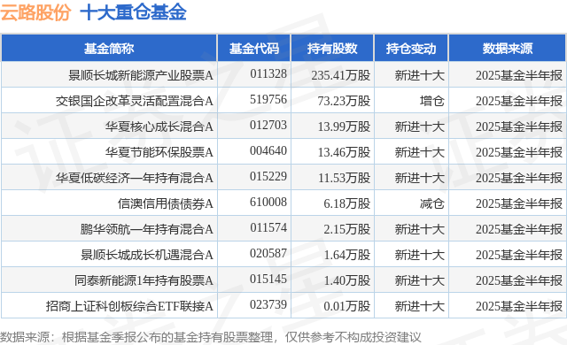 根据2025基金半年报公募基金重仓股数据,重仓该股的公募基金共10家,其中持有数量最多的公募基金为景顺长城基金的景顺长城新能源产业股票A。景顺长城新能源产业股票A目前规模为23.7亿元,最新净值1.4339(9月23日),较上一交易日下跌0.64%,近一年上涨76.87%。该公募基金现任基金经理为杨锐文 曾英捷。杨锐文在任的基金产品包括:景顺长城优选混合,管理时间为2014年10月25日至今,期间收益率为327.82%;景顺长城环保优势股票,管理时间为2016年3月15日至今,期间收益率为299.8%;景顺长城创新成长混合,管理时间为2019年10月17日至今,期间收益率为103.23%;景顺长城成长领航混合,管理时间为2020年5月28日至今,期间收益率为69.92%。