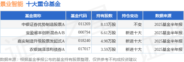 根据2025基金半年报公募基金重仓股数据,重仓该股的公募基金共4家,其中持有数量最多的公募基金为中银证券的中银证券优势制造股票A。中银证券优势制造股票A目前规模为0.6亿元,最新净值1.3755(9月23日),较上一交易日下跌1.49%,近一年上涨127.06%。该公募基金现任基金经理为张丽新。张丽新在任的基金产品包括:中银证券新能源混合A,管理时间为2022年12月24日至今,期间收益率为9.03%;