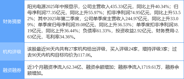 2025年8月29日,华安证券研究员张志邦发布了对阳光电源的研报《储能业务翻倍增长,盈利能力持续提升》,该研报对阳光电源给出“买入”评级。研报中预计公司2025-2027年归母净利润分别为149/160/178亿元,对应PE14/13/12x,维持“买入”评级。证券之星数据中心根据近三年发布的研报数据计算,该研报作者对此股的盈利预测准确度为94.27%。