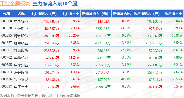 从资金流向上来看,当日工业金属板块主力资金净流出5.16亿元,游资资金净流入1.12亿元,散户资金净流入4.04亿元。工业金属板块个股资金流向见下表: