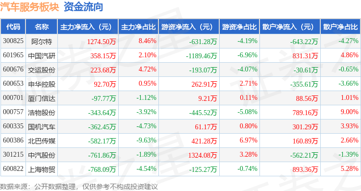 从资金流向上来看,当日汽车服务板块主力资金净流出966.96万元,游资资金净流出505.96万元,散户资金净流入1472.92万元。汽车服务板块个股资金流向见下表: