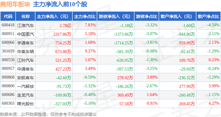 从资金流向上来看,当日商用车板块主力资金净流入1.95亿元,游资资金净流出1.17亿元,散户资金净流出7741.77万元。商用车板块个股资金流向见下表: