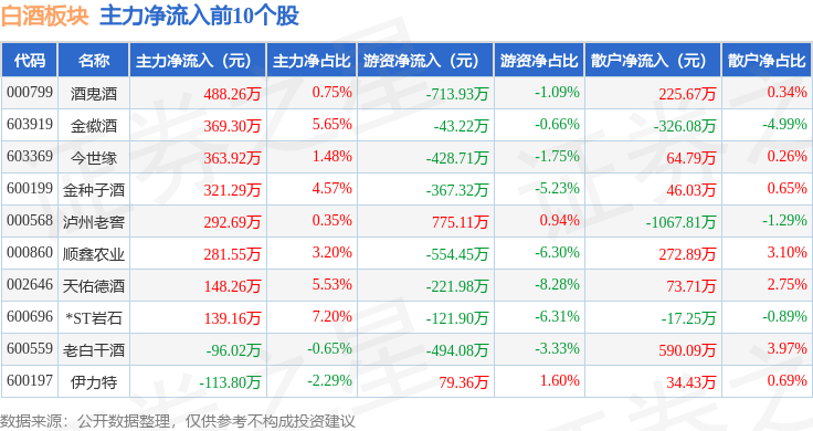 从资金流向上来看,当日白酒板块主力资金净流出3.94亿元,游资资金净流入3.0亿元,散户资金净流入9399.81万元。白酒板块个股资金流向见下表: